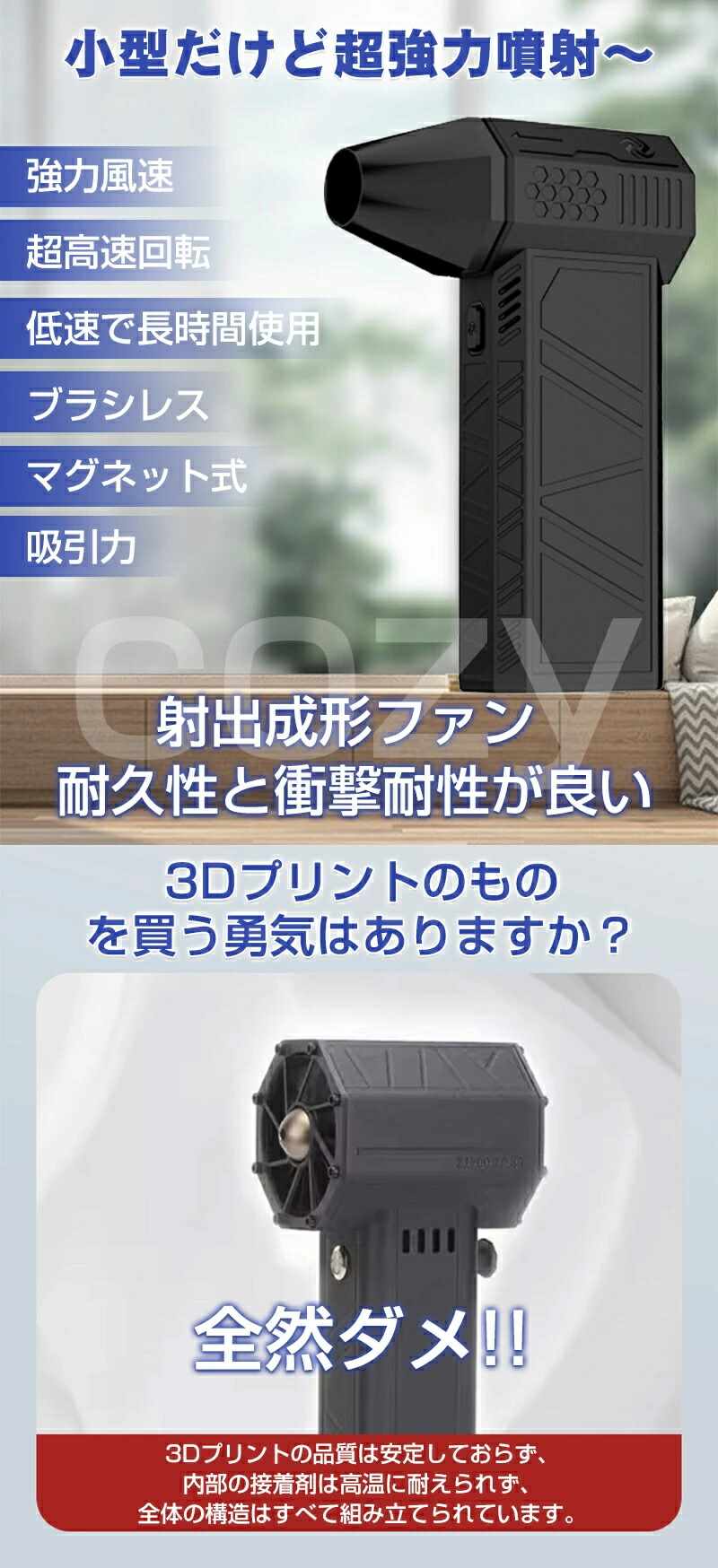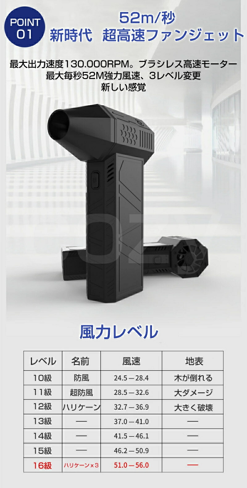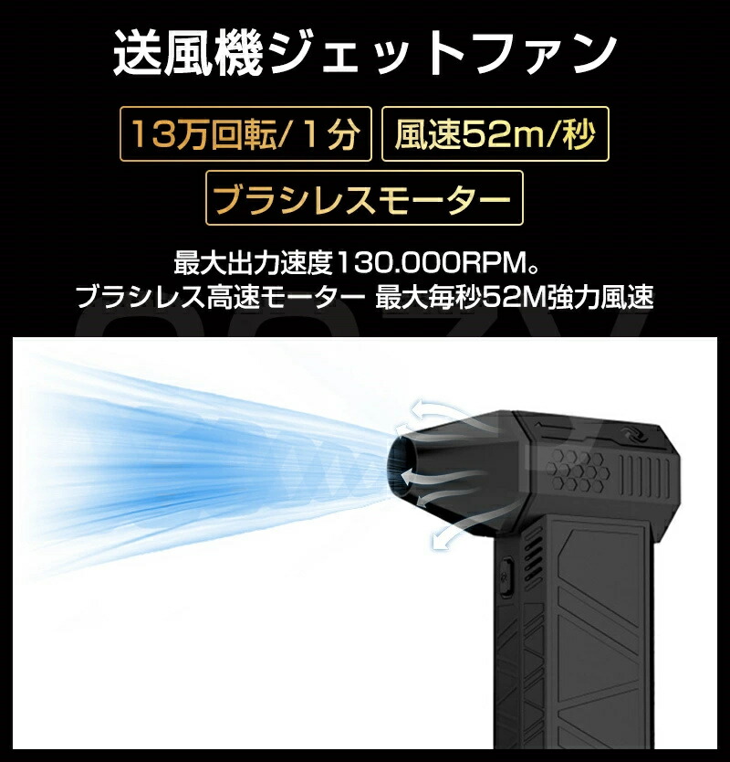【強力でポータブルなコードレスジェットブロワーファン】ジェットドライミニブロワーで比類のないエアフローを体験してください。 最大130,000 RPMの速度に達するブラシレス高速DCモーターを搭載しており、最大風速は52m/Sを超えており、車の乾燥、掃除、キャンプ、アウトドア活動に最適です。※【ご注意:フル充電での最速モードの使用可能時間は約10~12分間】