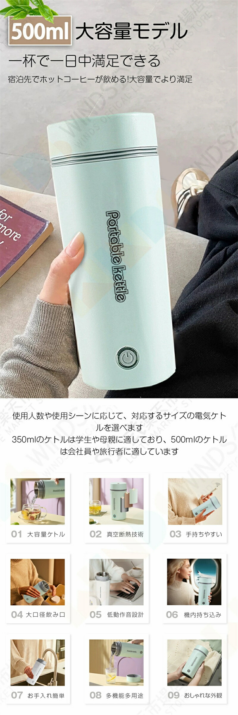 ★【500mlのメリット】500ML容量のケトルは室内だけでなく、旅行や出張にも最適です。大量の水が必要な場合は、500MLを選択すると、一度に複数の水のニーズに対応でき、繰り返し水を入れて沸騰させる手間が軽減されます。