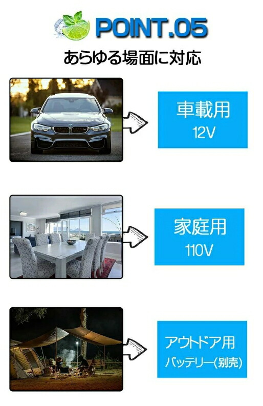 車載DC12V、家庭用AC100V電源対応、家庭用ACアダプターとDCシガープラグケーブルが同梱します。定格消費電力55W。
