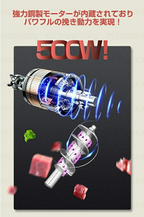 500Wの強力銅製モーターが内蔵されており、パワフルの挽き動力を実現します。肉類、魚類、野菜、生姜、にんにくなど、パワーフルなモーターは、様々な具材に適用し、簡単に細かく、そして速やかに挽くことができますので、具材を調理する時間も省けます。