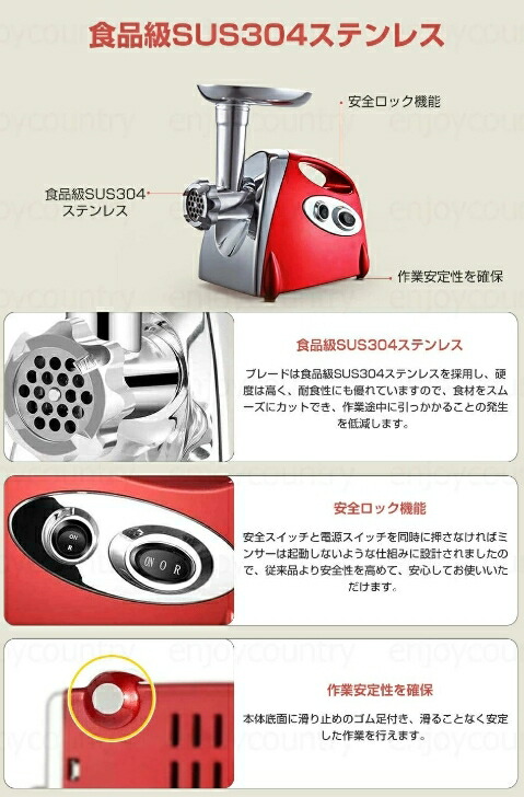 ◎【高い安全性】 誤操作による事故の発生を予防するために、安全ロック機能が追加されました。安全スイッチと電源スイッチを同時に押さなければミンサーは起動しないような仕組みに設計されましたので、従来品より安全性を高めて、安心してお使いいただけます。さらに、本体底面に滑り止めのゴム足付き、滑ることなく安定した作業を行えます。購入して頂いた後、もしご利用上に疑問点、または商品の品質に問題がございました場合、私達は積極的に処理いたしますので、ご連絡してお願い申し上げます。