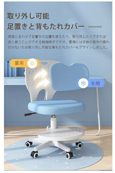 【取り外し可能・足置きと背もたれカバー】成 に合わせて 置きの位置を変えたり、取り外したりできれば く使うことができる勉強椅子ですが、夏場には子供の背中の蒸れが少ないため取り外し可能な背もたれカバーもデザインしました。