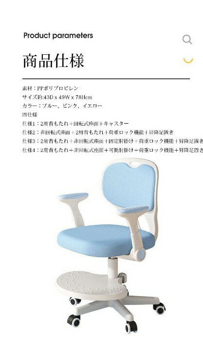 商品仕様 素材:PPポリプロピレン サイズ約:43D x 49W x 78Hcm カラー:ブルー、ピンク、イエロー 四仕様 仕様1:2用背もたれ+回転式座面+キャスター
