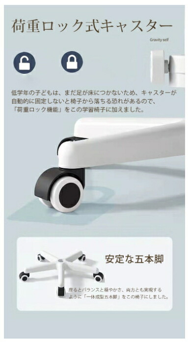 【自動ロックでき・安定キャスター】遊んでしまわないか心配なご両親の方々のために、子供が座った瞬間キャスターロックできる感圧式ロック機能を備えた小学生学習椅子を仕上げました、小学生や低学年の子供が使っている最中に後ろへ下がる恐れがありません。