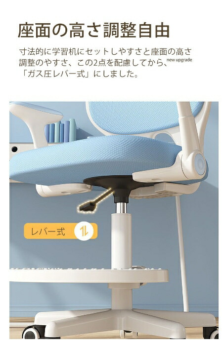 ポイント ●座面の高さを調整できる学習チェアです。