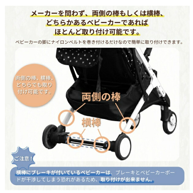 ベビーカーの足に取り付けるので、CombiやAprica、Pigeonなど様々なベビーカーに対応。ベビーカー以外にもペットカートやショッピングカートなどにも取り付けが可能です。