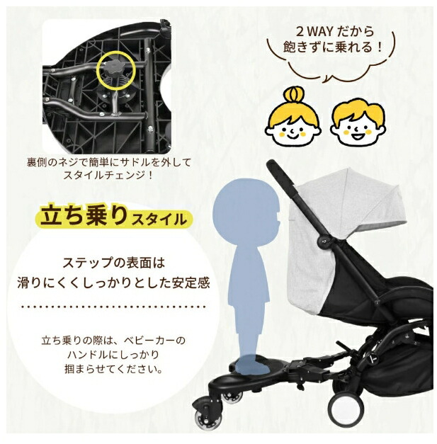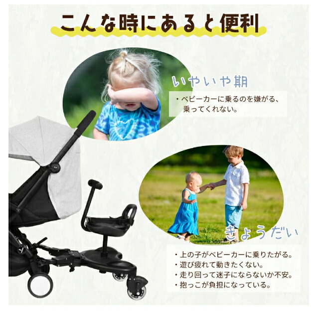 小さい子供を抱えての外出時に役立つベビーカーステップ。ベビーカーとステップ台に一人ずつ子供を乗せることができ、ベビーカーに乗りたがらない子もアトラクション感覚で楽しめます。
