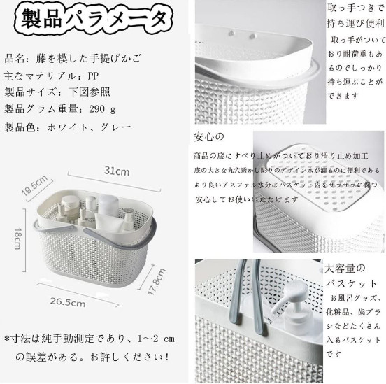 【商品内容】大容量マルチバスケット カラー: ホワイト、グレー。サイズ:26.5*17.8*18。 メイン素材: PP。バスケット 手提げ お 風呂 収納 バス ランドリー 多 機能 シャワー 水切り 温泉 ポーチ スパ バッグ 用 品 化粧 入れ バスルーム バスバスケット 浴室用 収納ボックス 手提げ バスバスケット 収納かご 収納バスケット 手提げ お風呂収納バスケット 浴室用 バス用品収納 温泉 ポーチ 小物収納