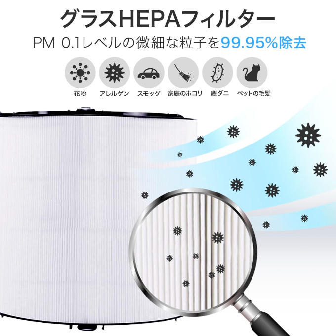 密閉性の高いグラスHEPAフィルターが、PM 0.1レベルの微細な粒子を99.95%除去