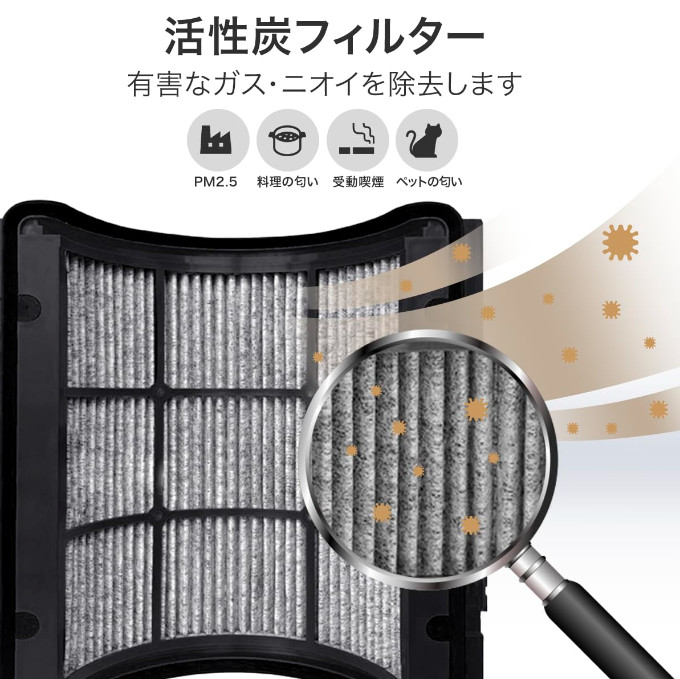 活性炭の吸着力で、有害なガスやたばこの臭い・生ごみなど生活臭を除去しクリーンな空気を保ちます。