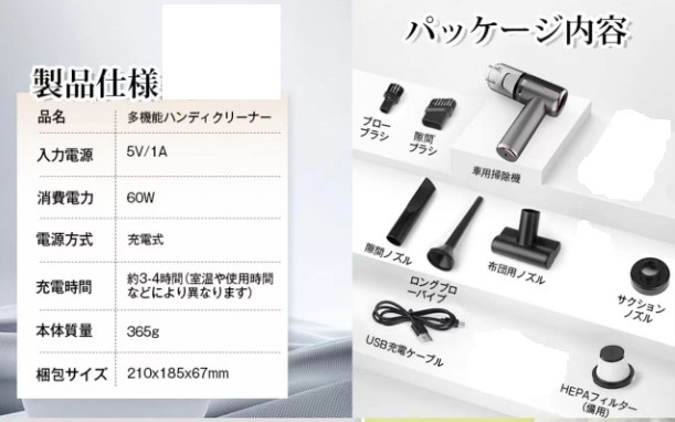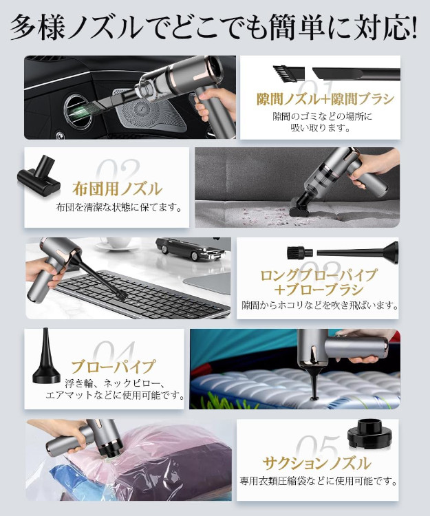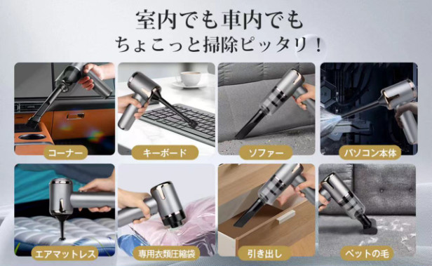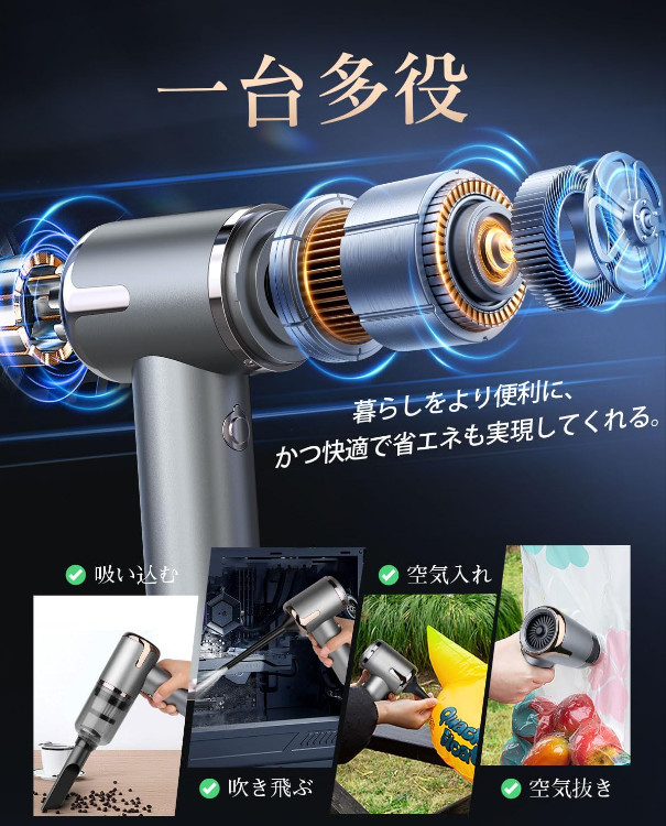 商品特徴 ★★★【2024新登場!十分な吸引力】 ▲吹き飛ぶ▲ 吸い込む ▲空気入れ ▲空気抜き。本製品はミニ掃除機/エアダスター/電動エアーポンプとして利用可能です。ソファの隙間、キーボード、車内掃除、ネックピロー、エアベッド、エアボート、専用衣類圧縮袋などの場所に使用可能です。7種の交換用アタッチメントを備えて異なる用途に使えて、車内/自宅兼用のハンディクリーナーです。