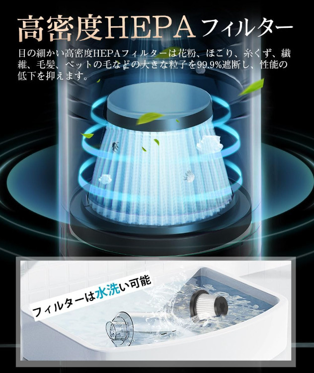 ★★★【シルバー塗膜採用・高級感・お手入れ簡単】本製品はシルバー塗膜を採用して、高輝度のメタリック効果があります。色持ちがよく、耐摩擦性に優れています。高密度HEPAフィルターを採用して、ろ過率は99%以上にもなり、性能の低下を抑えます。取り外し可能、水洗いOK、手入れしやすいです。定期的なお手入れにをすることで、吸引力を長続きさせることができます。