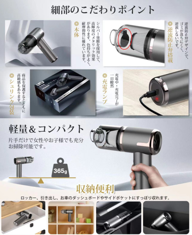 ★★★【シュリンク包装・プレゼントに適応】 弊社のハンディクリーナーはシュリンク包装を採用して、商品を保護するとともに光沢感のある美しい見た目になります。軽量でわずか0.37kg、ワンハンドで握りやすいハンディ掃除機です。綺麗にお掃除、腕への負担も軽減ます。敬老の日、 父の日、母の日、誕生日、クリスマス、お歳暮など祝日の場合、贈り物としてもおすすめ!