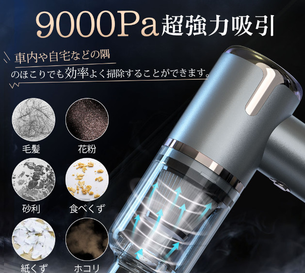 ★★★【ブラシレスモータ搭載・超強力モーター】この車用掃除機はブラシレスモータとを採用して、普通なブラシモーターと比べては長寿命/低騒音/電磁ノイズが少ない/省エネが可能/効率がよく/メンテナンス性など利点があります。アップグレードされた超強力モーターを採用、最大9000Paの吸引力をサポートし、ゴミをを逃さずしっかり吸い取ってくれます。場所を選ばずどこでも簡単に使えるようになりました。