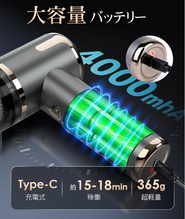 ★★★【4000mAh内蔵バッテリー・USB充電式】ハンディ掃除機は大容量4000mAhバッテリーが内蔵され、約3~4h時間のフル充電で15~18分連続使用可能です。USB充電式ので、万が一充電を忘れた場合、付属のケーブルに接続し充電できます。コードレス式で、家/オフィス/車どこでもとても便利です。●最初に使用する前に完全に充電してください。5V/1Aのプラグのご使用をお勧めいたします。