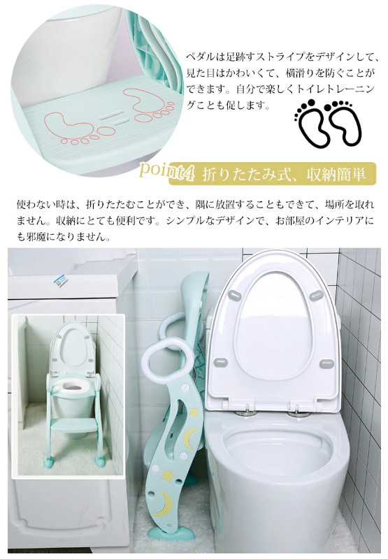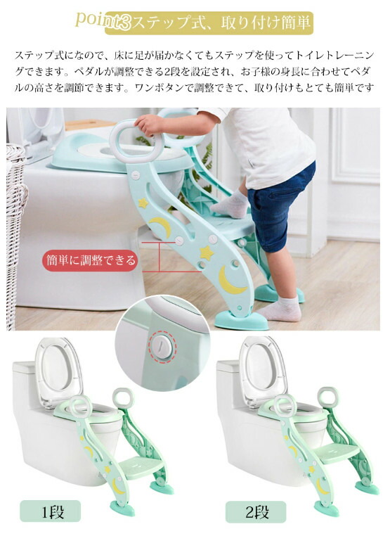ステップ式になので、床に足が届かなくてもステップを使ってトイレトレーニン グできます。ペダルが調整できる2段を設定され、お子様の身長に合わせてペダ ルの高さを調節できます。ワンボタンで調整できて、取り付けもとても簡単です