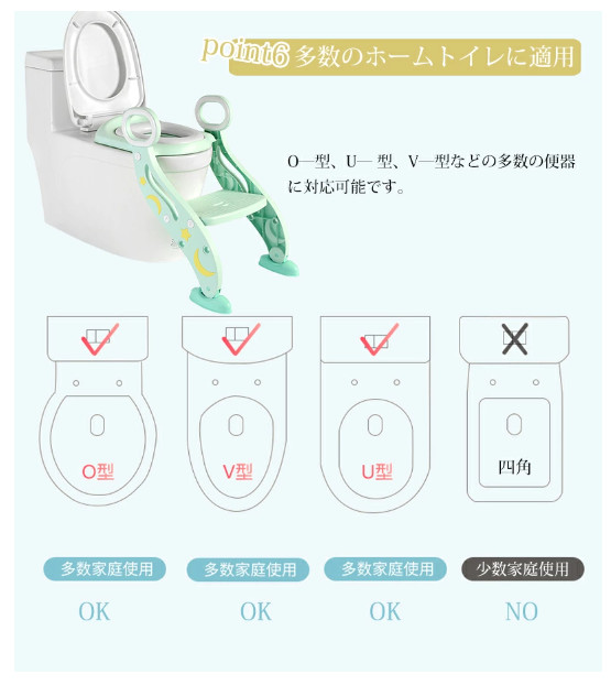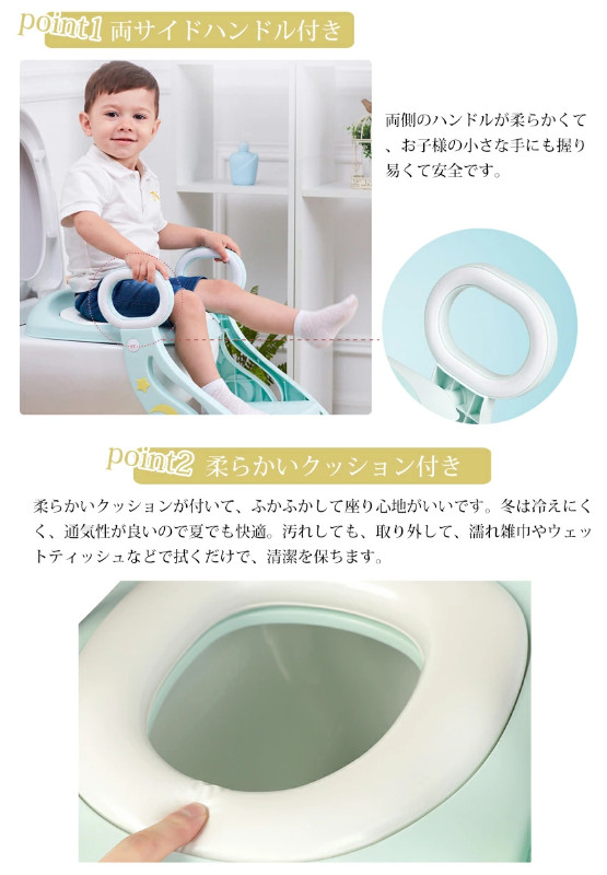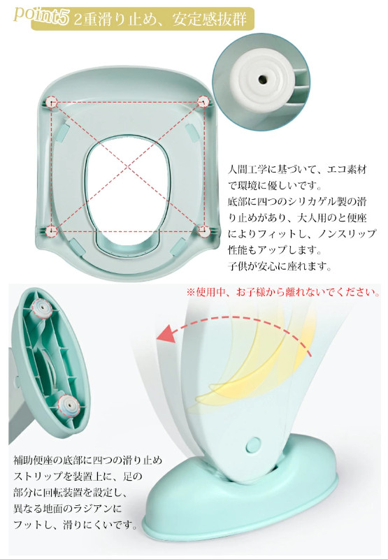 人間工学に基づいて、エコ素材で環境に優しいです。底部に四つのシリカゲル製の滑 り止めがあり、大人用のと便座によりフィットし、ノンスリップ性能もアップします。 子供が安心に座れます。