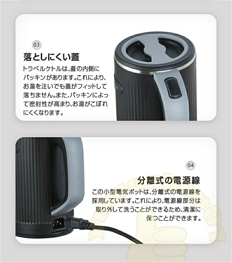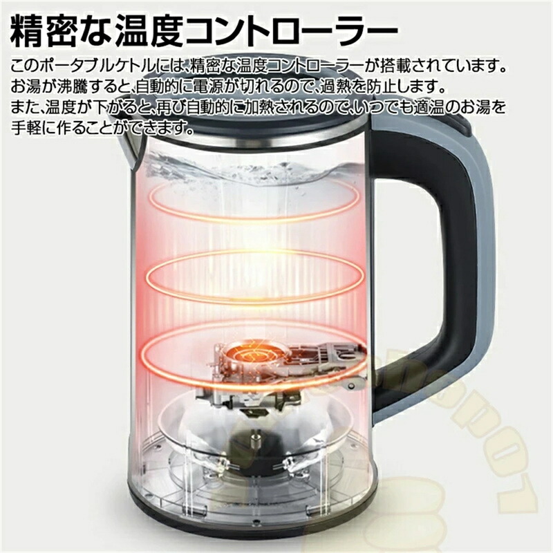このポータブル電気ケトルは、スタイリッシュなデザインが特徴です。本体と台座を一体化させることで、持ち運びがしやすく、スペースを取らずに収納できます。ストリップでデザインされた外側は、おしゃれで滑りにくいです。さらに、お湯が沸騰しても外側は熱くなりません