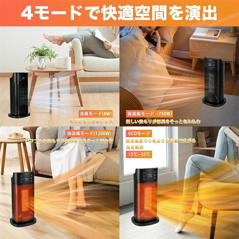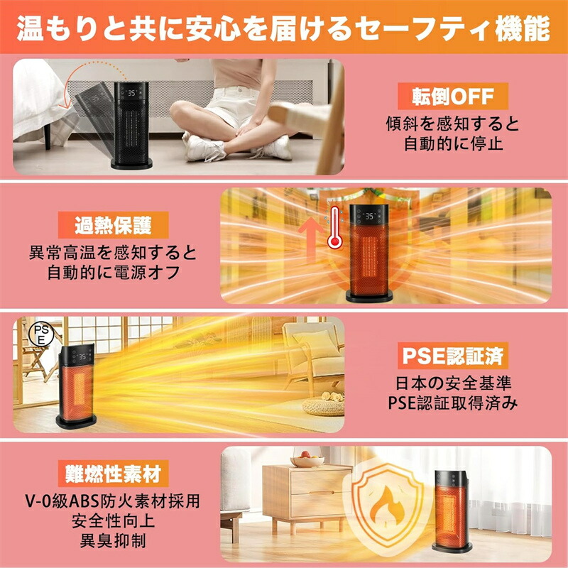 安心の多重安全機能!転倒時自動オフ&過熱保護機能:転倒時自動オフ機能と過熱保護機能を搭載しており、事故や火災を未然に防ぎます。さらに、難燃性素材を使用した電気ヒーターなので、長時間の使用でも安心してお使いいただけます。ストーブやファンヒーターとして、あらゆる空間で安全に暖房効果を発揮し、リビングや寝室はもちろん、トイレやオフィスでも安心してご利用いただけます。過熱時には自動冷却機能が作動し、ヒーターを安全に保ちます。コンパクトな小型セラミックヒーターとして持ち運びも簡単で、必要な場所にすぐに移動できる便利さも魅力です