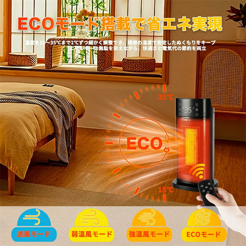 ECOモードで省エネ!効率的な温度調整で快適な空間作り:ECOモードが搭載されており、周囲の温度に応じて自動で出力を調整し、無駄な電力消費を抑えます。省エネ設計で、長時間の使用でも経済的です。また、設定温度に達するとヒーターの加熱要素は停止しますが、ファンは引き続き稼働し、熱を均一に加熱空間に分布させます。温度が設定値を下回ると、加熱要素が自動的に再起動します。コンパクトなヒーター 小型でありながらも、広い部屋でもしっかりとした暖房効果を発揮。温風ヒーターとして1~12時間のタイマー設定が可能で、寝室やリビングでも快適に使用できます。従来の電気ストーブや電気ファンヒーターに比べ、省エネ性能に優れており、暖房費を節約しつつ快適な暖かさを保ちます
