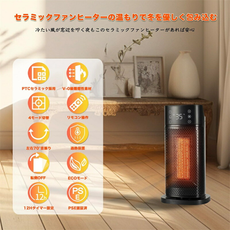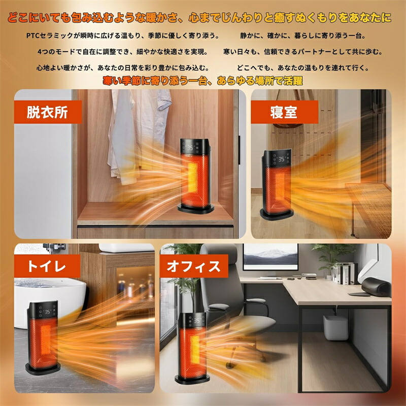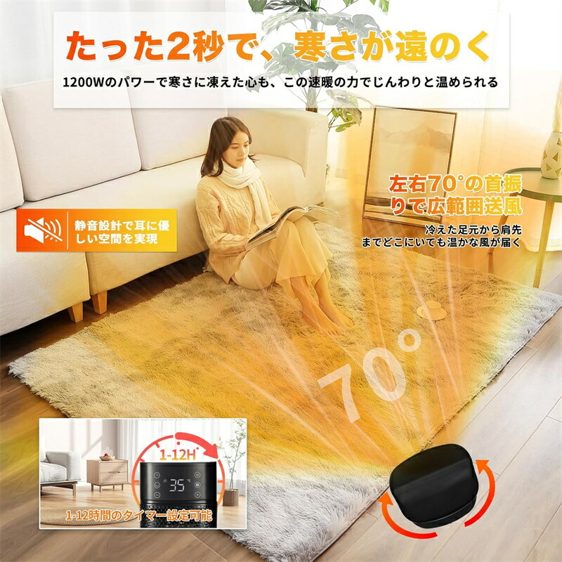 左右70°の首振り機能で広範囲を効率的に暖めるセラミックファンヒーター:左右70°の自動首振り機能を搭載しており、部屋全体をムラなく暖めることができます。リビング、寝室、オフィス、キッチンなど、さまざまな場所で使用でき、狭い空間でも快適な暖かさを提供します。特にヒーター for roomとして、家庭用の暖房器具としてはもちろん、オフィスやトイレ、廊下などのスポット暖房にも最適です。電気ファンヒーターとしての温風到達範囲は広く、従来のストーブやハロゲンヒーターに比べて効率的に広範囲を暖められるのが特徴です。寒い冬でもしっかり暖かさを保つ、信頼の一台です