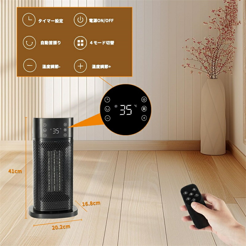 リモコン操作で快適&簡単に使用可能:このヒーターはリモコン付きで、遠隔操作が可能です。寝室やリビング、オフィスなど、どんな場所でも手軽に快適な暖かさを提供します。コンパクトで軽量な設計により、持ち運びが簡単で、狭いスペースにもすっきり設置可能です。さらに、このセラミックヒーターはスポット暖房にも優れており、迅速に室内を暖めることができます。冷却機能も搭載されており、安全機能も充実しているため、長時間の使用でも安心してご利用いただけます