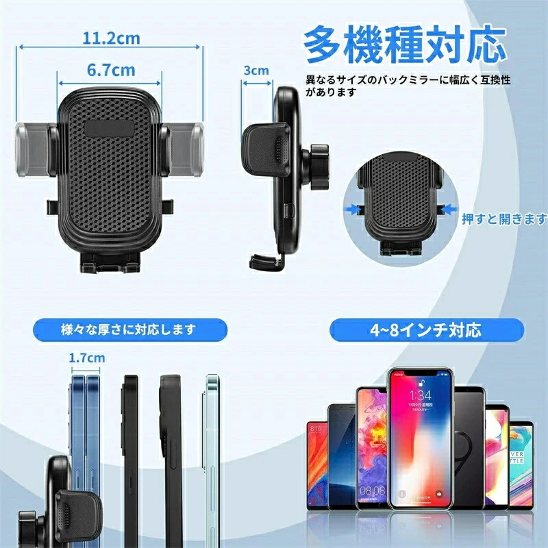 ・「広範な互換性」 このホルダーは、さまざまな種類のスマートフォンや