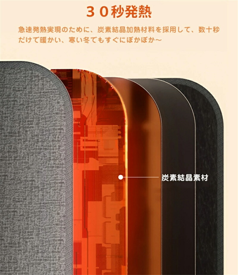 急速発熱実現のために、炭素結晶加熱材料を採用して、数十秒だけで暖かい、寒い冬でもすぐにぽ かぽか~