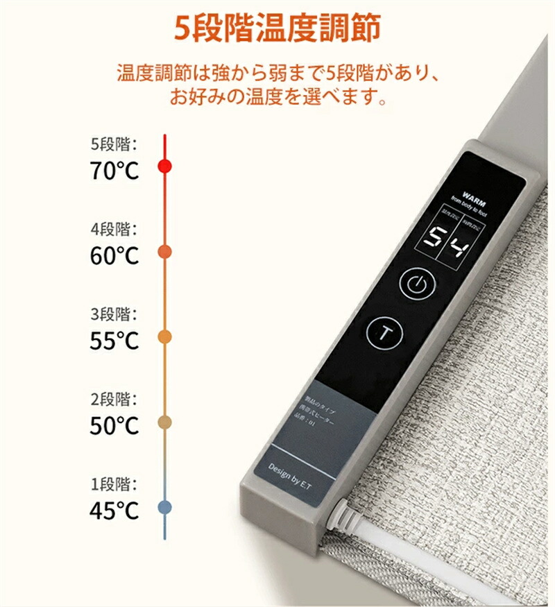 5段階の温度を調整可能で、天気や室温や発熱範囲に合わせて簡単に温度調整でき、適当の温度を 自由に設定。