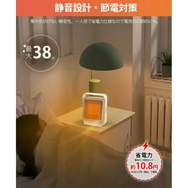 【静音・上下角度調節・シンプル操作】スイッチ一つで難しい設定もなく、つけて2秒で温風が出るミニセラミックヒーター。さらに、上下角度も上向き30°、下向き10°まで調節可能。冬のデスクワークで冷えやすい手元や、キッチンに立った時やお風呂上りの脱衣所などで、足元を狙ってしっかり温めてくれます。38dBと静音性に優れ、就寝前時・読書・勉強・テレワーク/・在宅勤務など、集中したい時も快適に使えるミニセラミックファンヒーター。