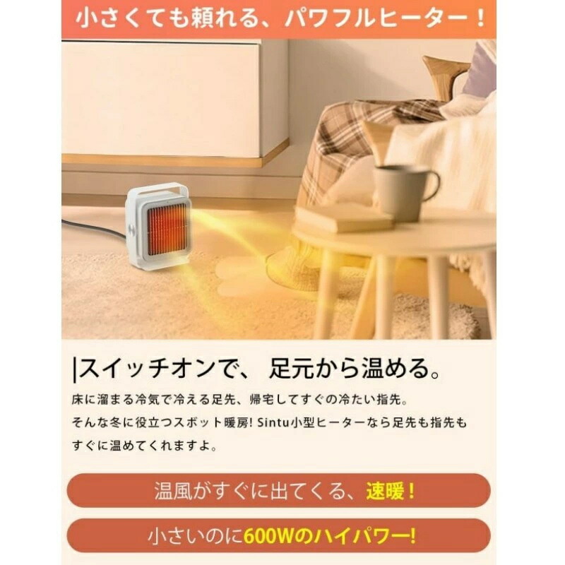 ポイント 【2秒速暖!ミニでもパワフル】小さいのに最大600Wのハイパワー!スイッチを入れると瞬時に温風が出る速暖セラミックファンヒーター。場所を選ばない超小型サイズ!パソコン作業や勉強中などの手元をあたためてくれたり、デスク下の足元や脱衣所・トイレなどパーソナルな小スペースをピンポイントで暖める小型ヒーター!空気を汚さず、持ち運びやすく、安全機能も付きなので、冬のキャンプや車中泊で活躍する小型電気ヒーター。