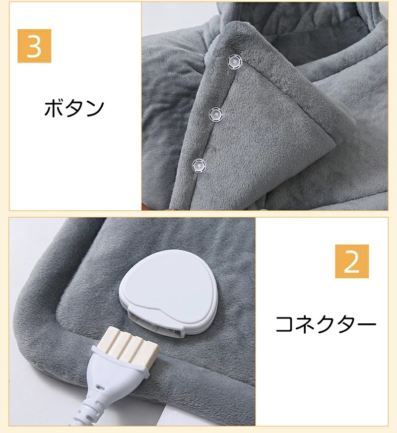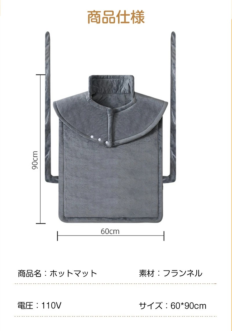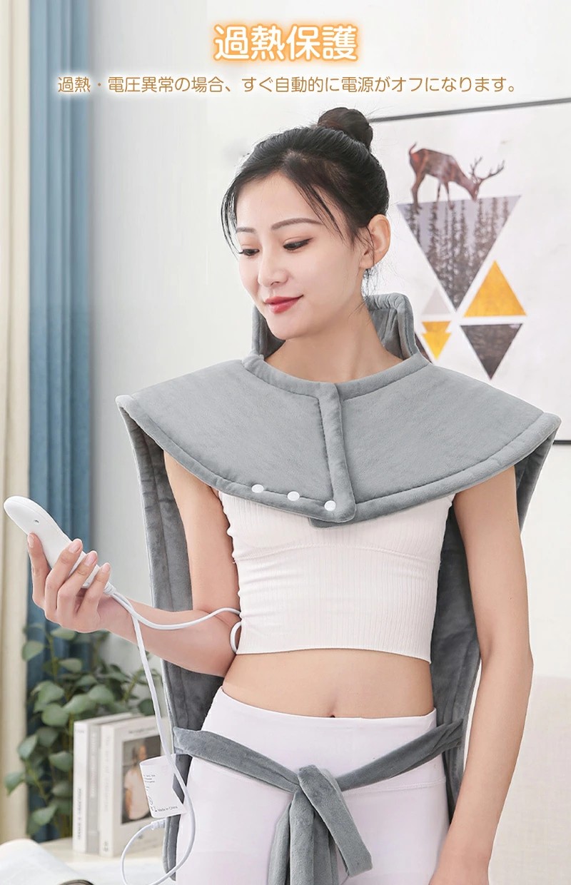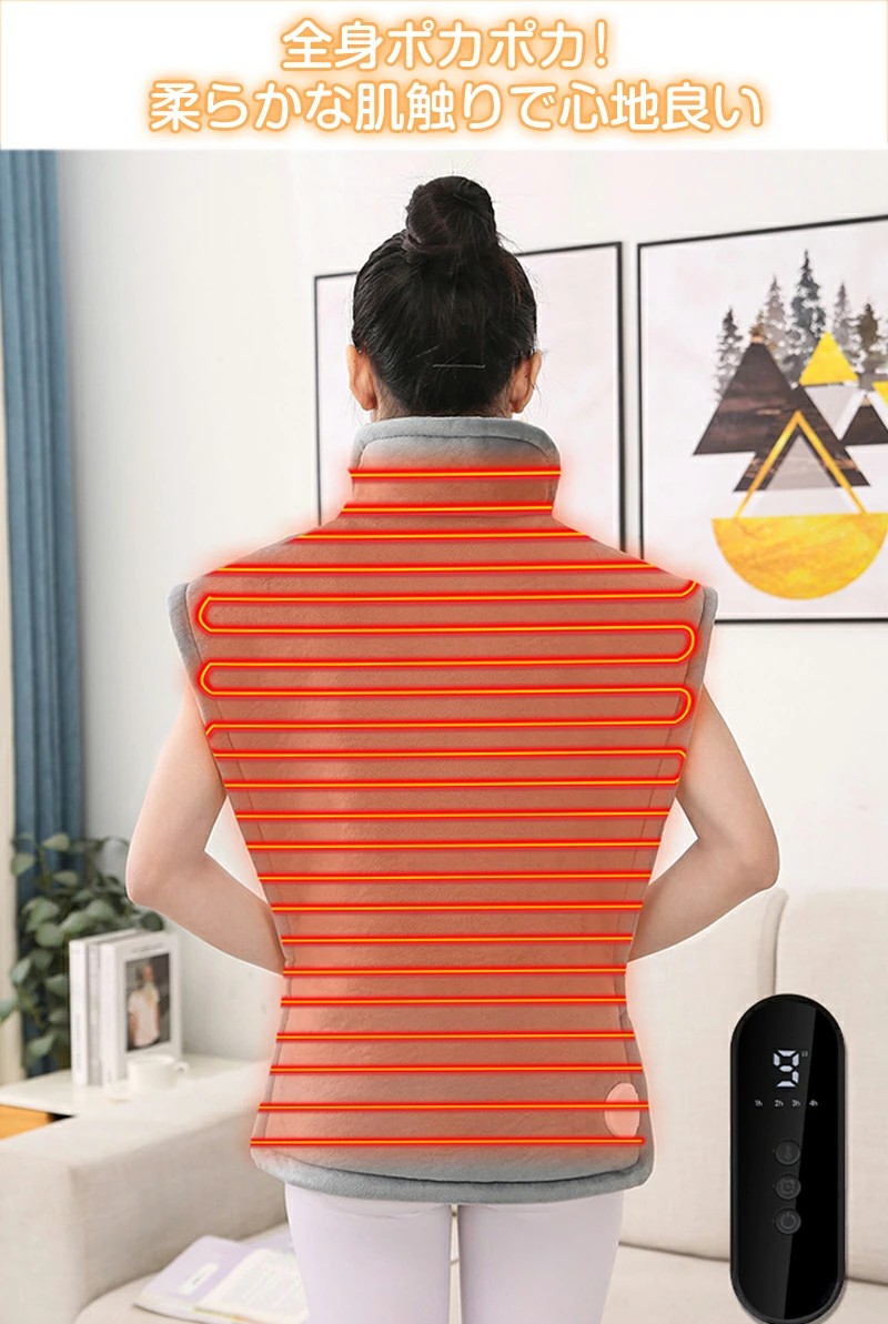 肩からしっかりあたためるヒーター付きで、電気パッドを着れば、ぽかぽかと気持ちよく全身まで温めることができます。高速加熱技術を備えた電熱線は首と肩を迅速且つ均一的にあたためます。寒い冬でも冷えをすばやく解消します。