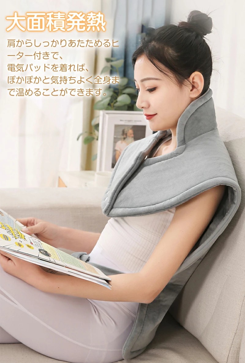 肩からしっかりあたためるヒーター付きで、電気パッドを着れば、ぽかぽかと気持ちよく全身まで温めることができます