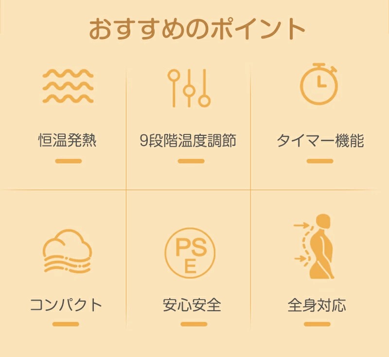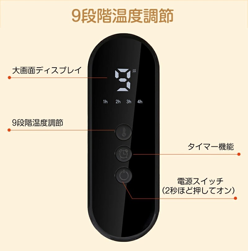 タイマー機能:長時間のつけっぱなしを防止し、切り忘れの心配を減らすことができ、高齢者の方にも安心です。電気代の節約にもなります。