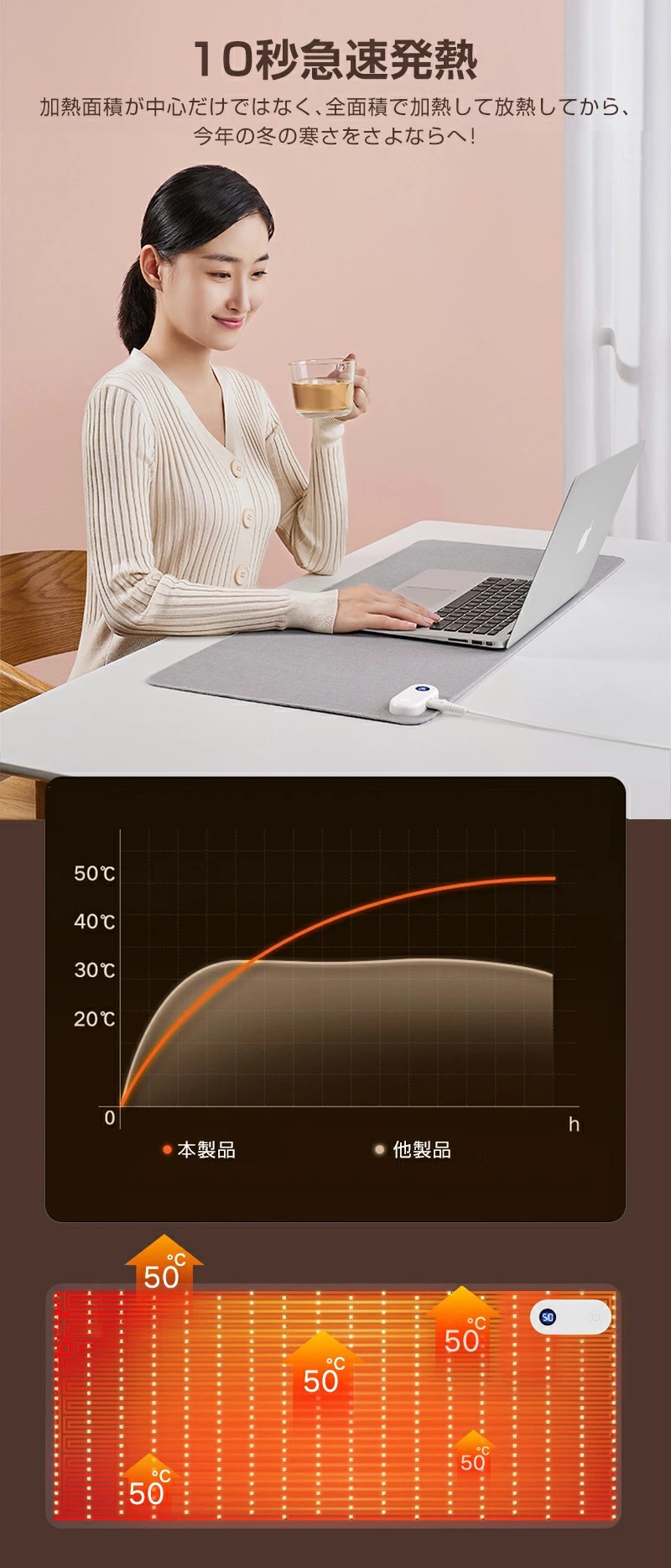 この加熱マウスパッドは熱伝導率に優れた金属加熱フィルムを採用して、わずか10秒で春のような暖かさを楽しむことができ、長く待つ必要はありません。