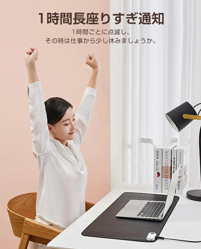 タイマー機能があり、1時間経過毎にランプが10秒ほど点滅して時間の経過をお知らせし、休憩時間の目安などにしてください。