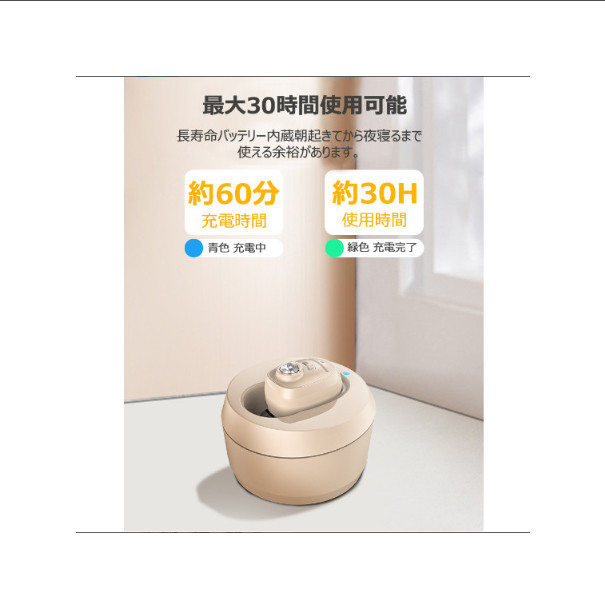 小さくて面倒な電池交換は不要です。たった約1時間ほどの充電で20~30時間稼働します。家での使用はもちろん、外出や旅行先でも大活躍します。