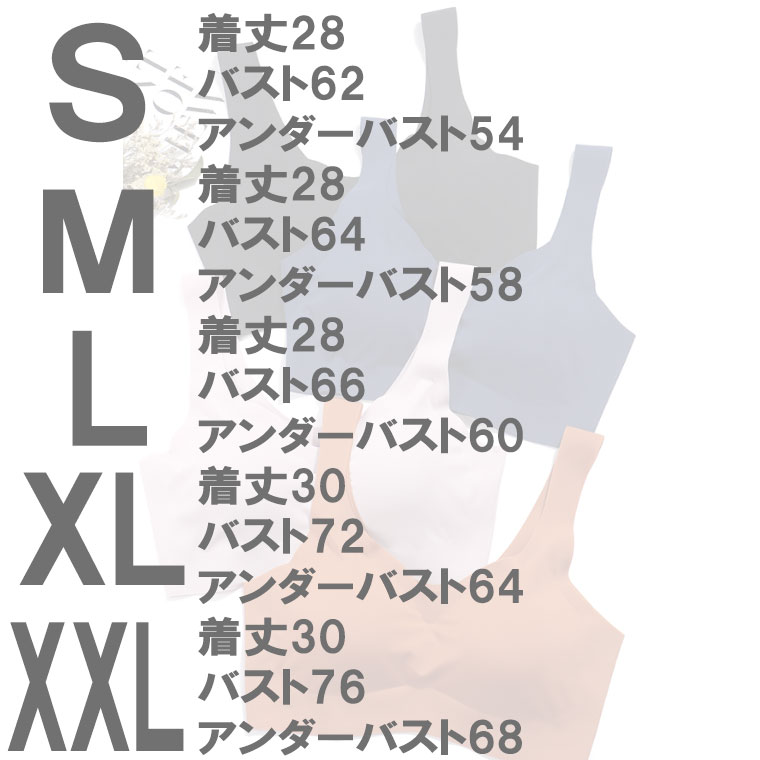 S 着丈28 バスト62 アンダーバスト54 M 着丈28 バスト64 アンダーバスト58 L 着丈28 バスト66 アンダーバスト60 XL 着丈30 バスト72 アンダーバスト64 XXL 着丈30 バスト76 アンダーバスト68