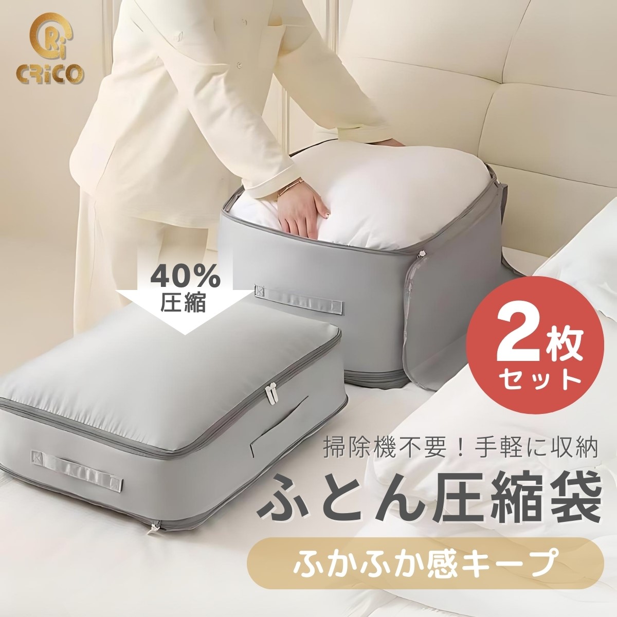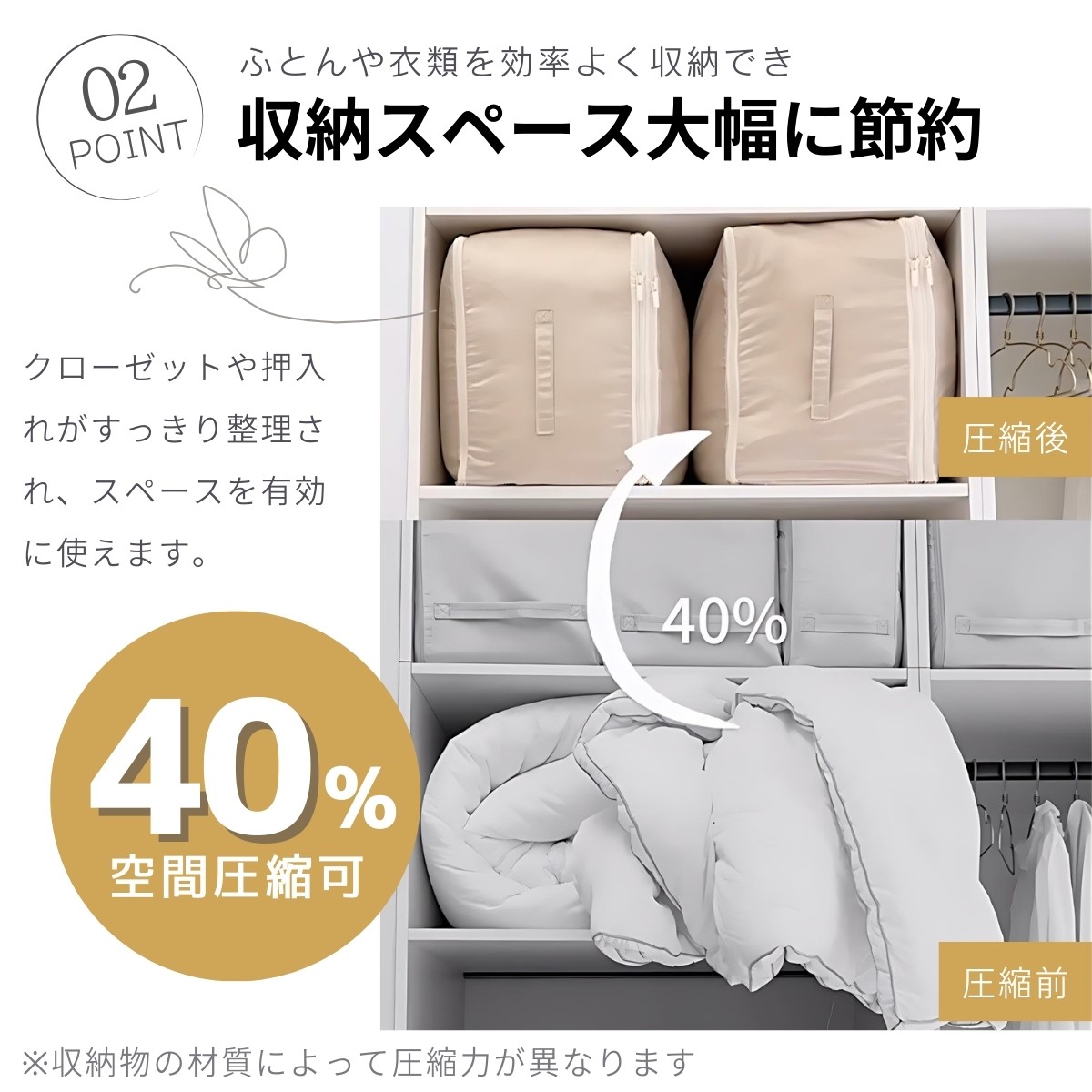 圧縮することで、ふとんの収納スペースを最大限に節約できます。クローゼットや押入れがすっきり片付きます。さらに、最大で40%の空間圧縮が可能です。