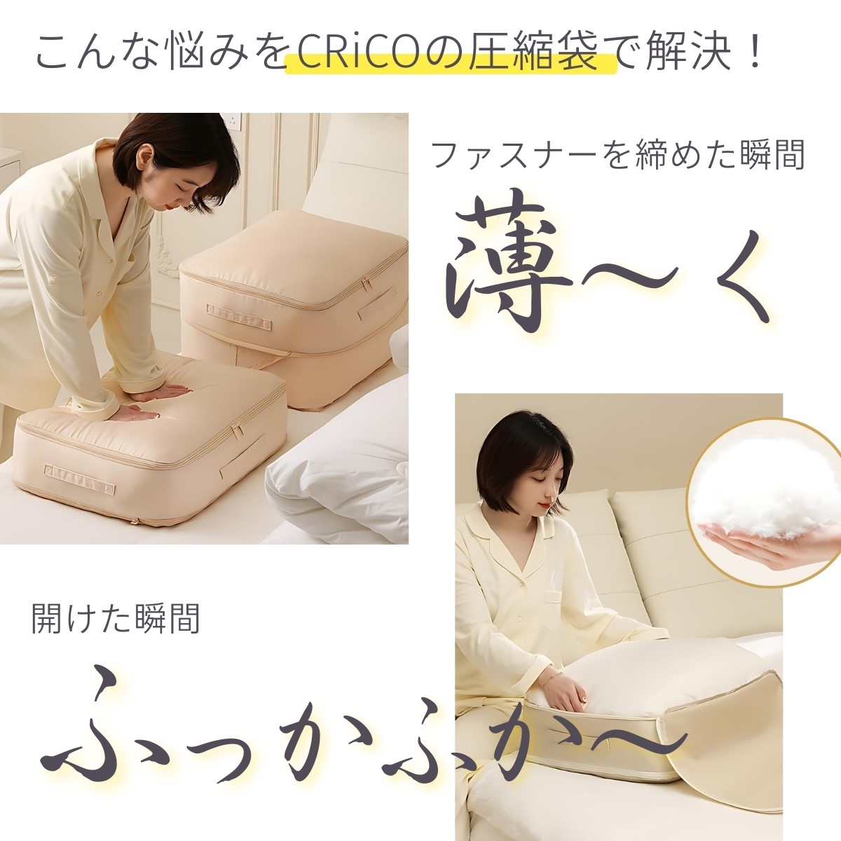 ファスナーを閉めるだけで簡単に布団、衣類を圧縮。