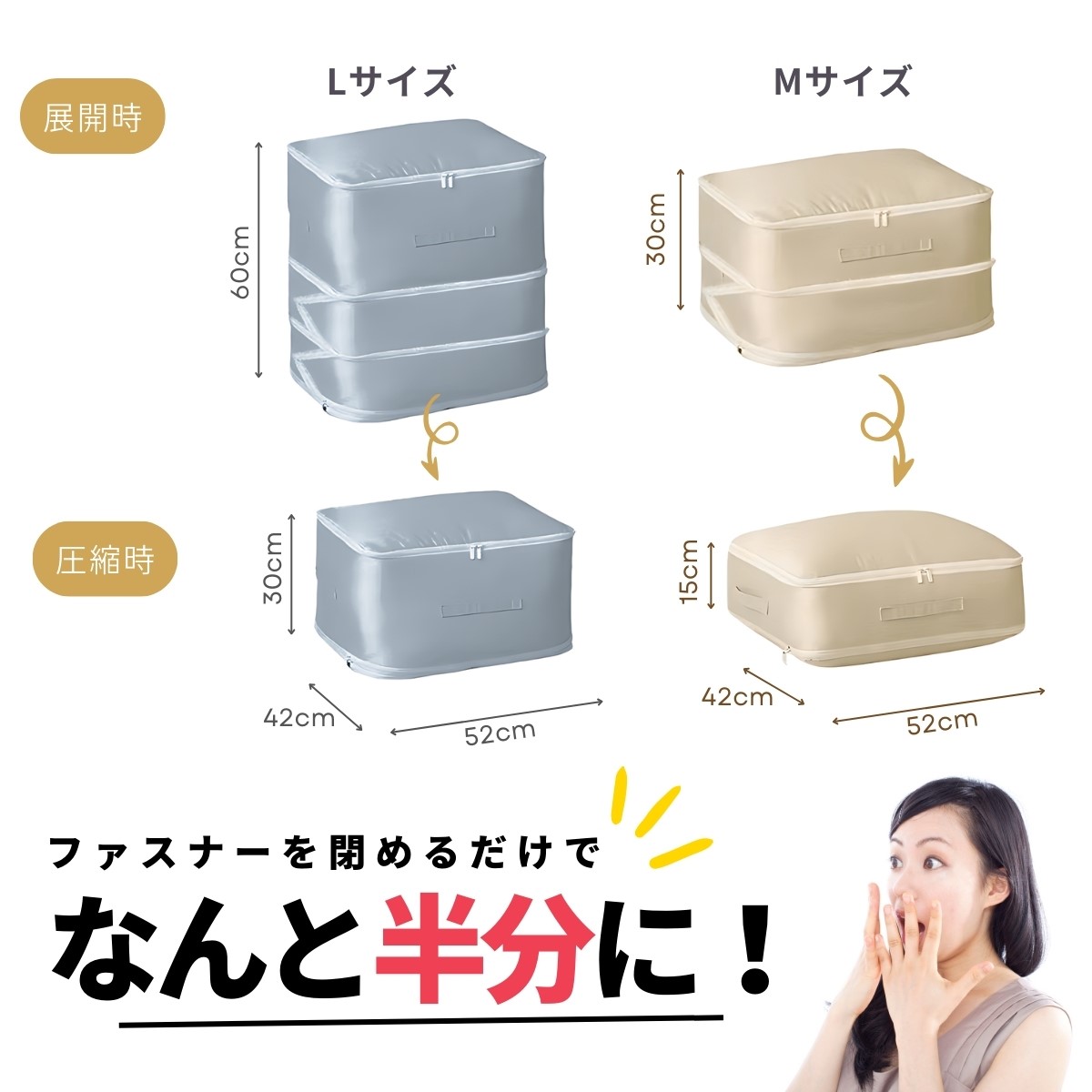 L:約42cm×52cm×30cm特徴 ファスナーを閉めるだけで布団や衣類を簡単圧縮!