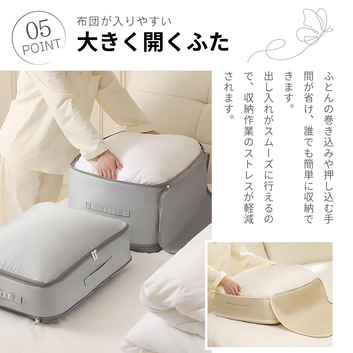 圧縮袋のふたが大きく開くため、ふとんを簡単に入れることができます。ストレスなく収納できるので、忙しい日常でも手間がかかりません。