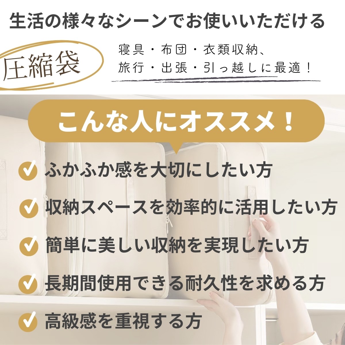 ・衣類を簡単に圧縮でき、衣類スペースを約40%節約!