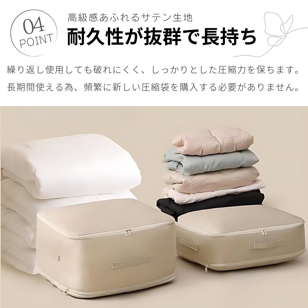 高品質な材料を使用しているため、当社の圧縮袋は非常に頑丈です。繰り返し使用しても破れにくく、しっかりとした圧縮力を保ちます。これにより、大切なふとんを安心して収納できます。さらに、長期間使えるため、頻繁に新しい圧縮袋を購入する必要がありません。これによって、経済的にも大変お得です。「耐久性が抜群で、長く使えます!」と多くのお客様からご満足いただいています。この機会に、ぜひその耐久性と経済性を実感してください。今すぐご購入を検討いただき、ふとんの収納をもっと簡単で便利にしましょう!