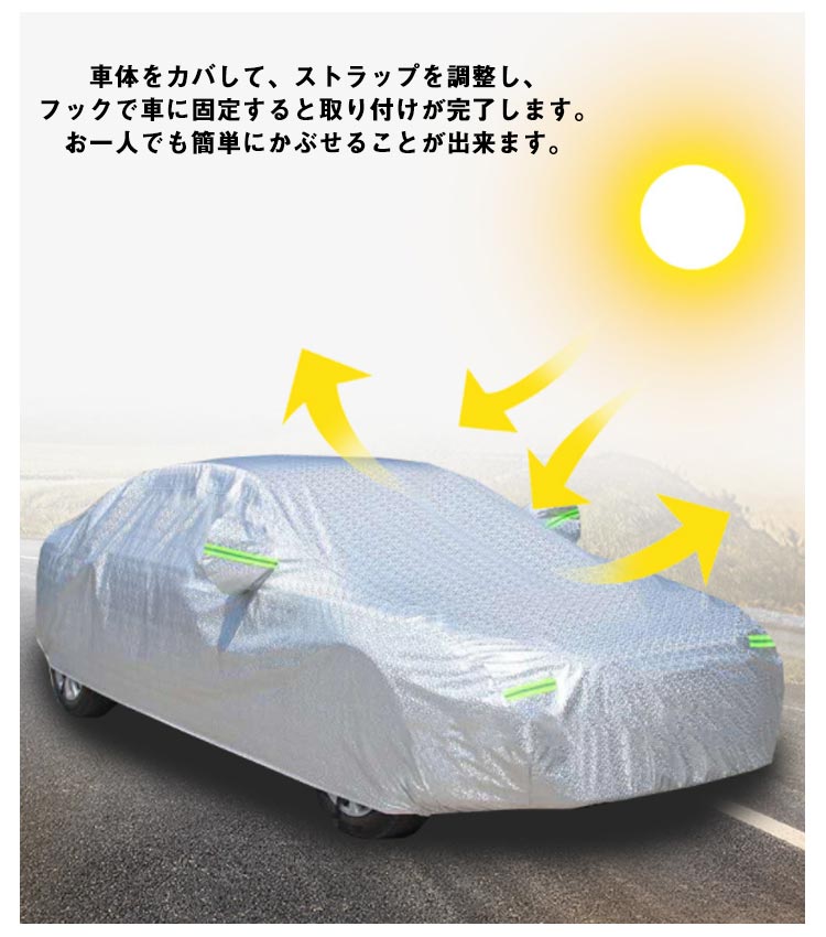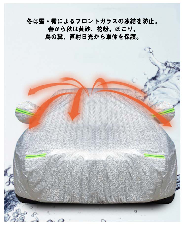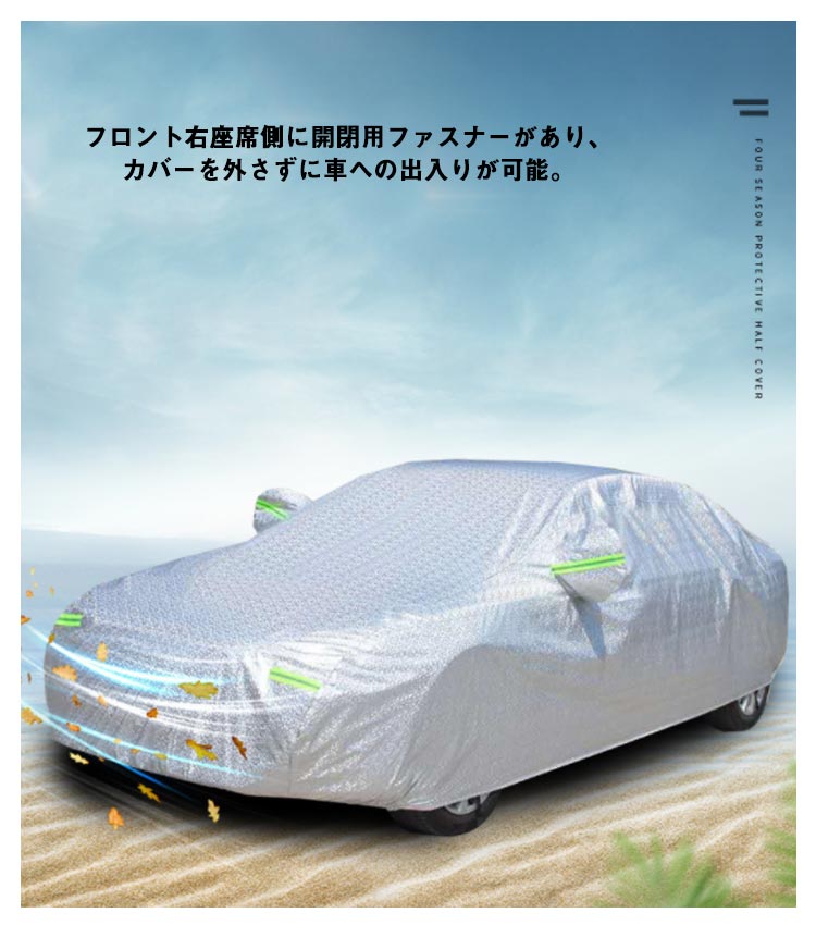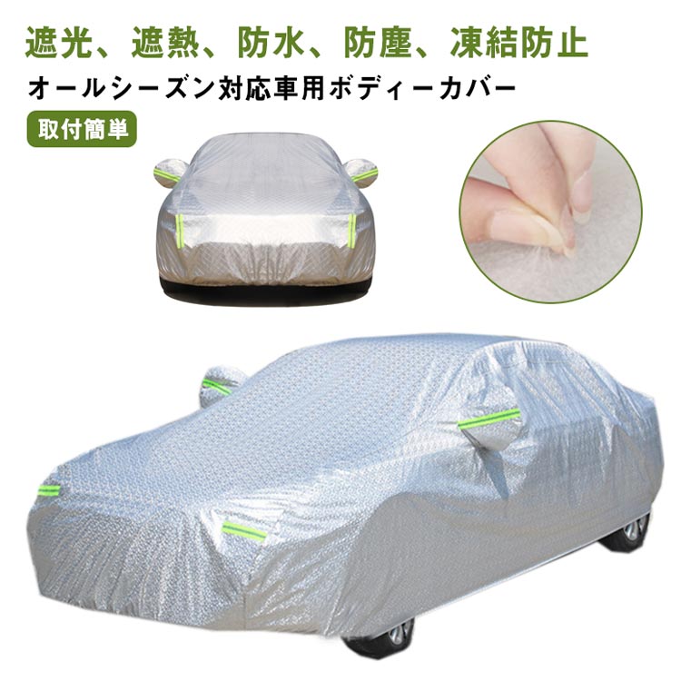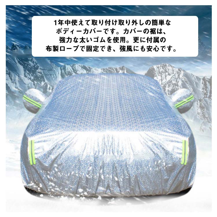 オールシーズン対応車用ボディーカバー【遮光、遮熱、防水、防塵、凍結防止】 冬は雪霜によるフロントガラスの凍結を防止。春から秋は黄砂、花粉、ほこり、鳥の糞、直射日光から車体を保護。 フロント右座席側に開閉用ファスナーがあり、カバーを外さずに車への出入りが可能。 1年中使えて取り付け取り外しの簡単なボディーカバーです。カバーの裾は、強力な太いゴムを使用。更に付属の布製ロープで固定でき、強風にも安心です。 【取付簡単】車体をカバして、ストラップを調整し、フックで車に固定すると取り付けが完了します。お一人でも簡単にかぶせることが出来ます。