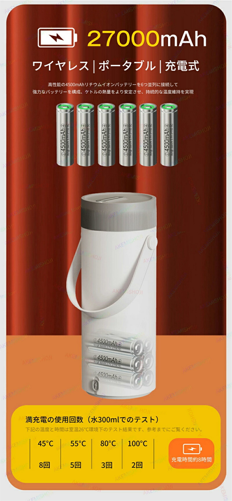 27000mAhの大容量電池を内蔵しており、8時間のフル充電後、100℃に設置すれば、2回使えます。80℃に設置すれば、3回使えます。55℃に設置すれば、5回使えます。45℃に設置すれば、6回使えます。