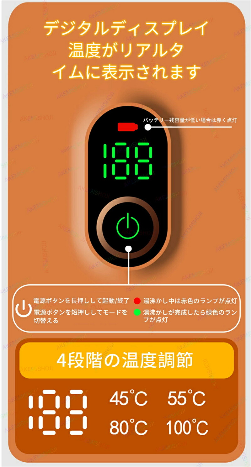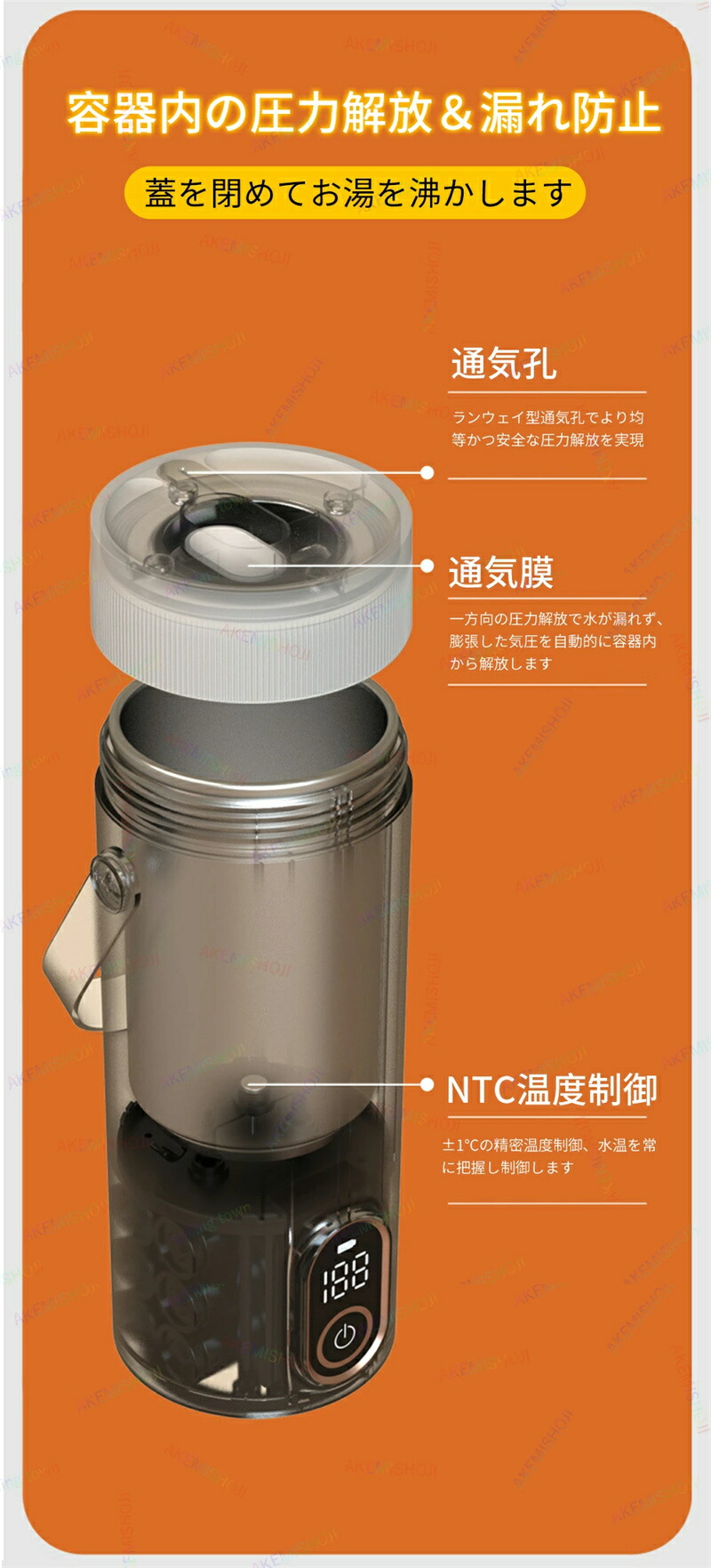 一時で360°逆さまに漏れることはありません。水が沸騰すると、電気ケトルは自動的に警報を発し、加熱を停止します。インテリジェントな温度制御により、いつでもどこでもカップ内の液体の温度を知ることができます。統合されたデザインはあなたの旅をより安全にします