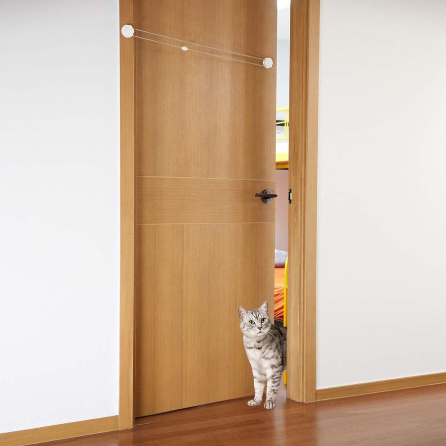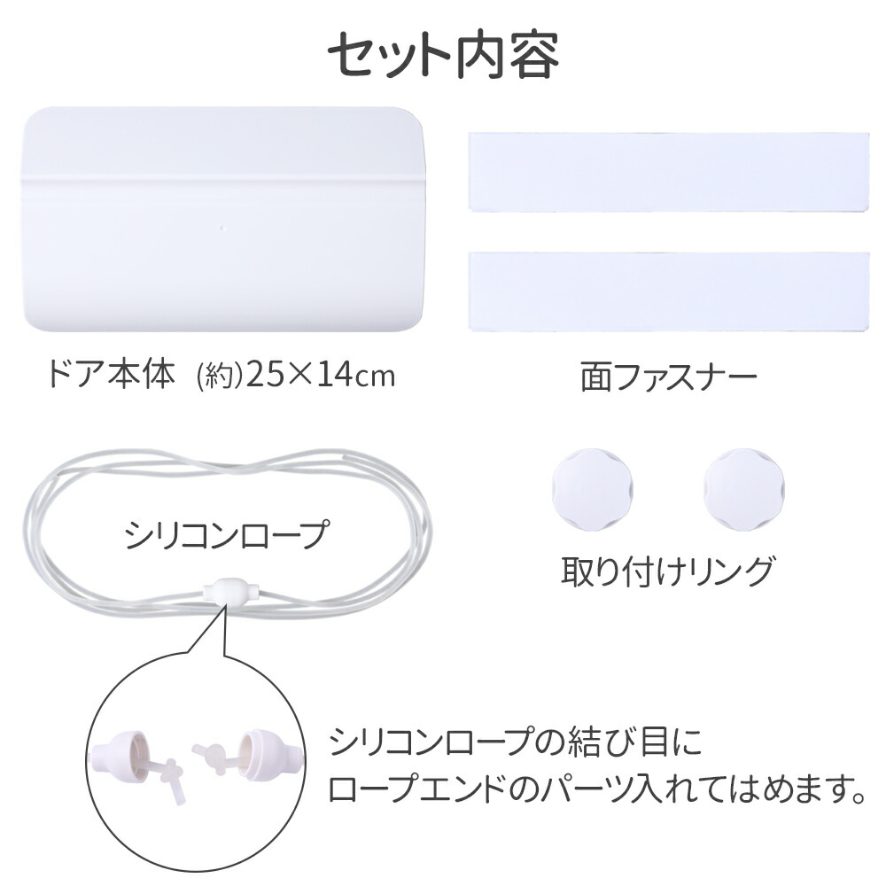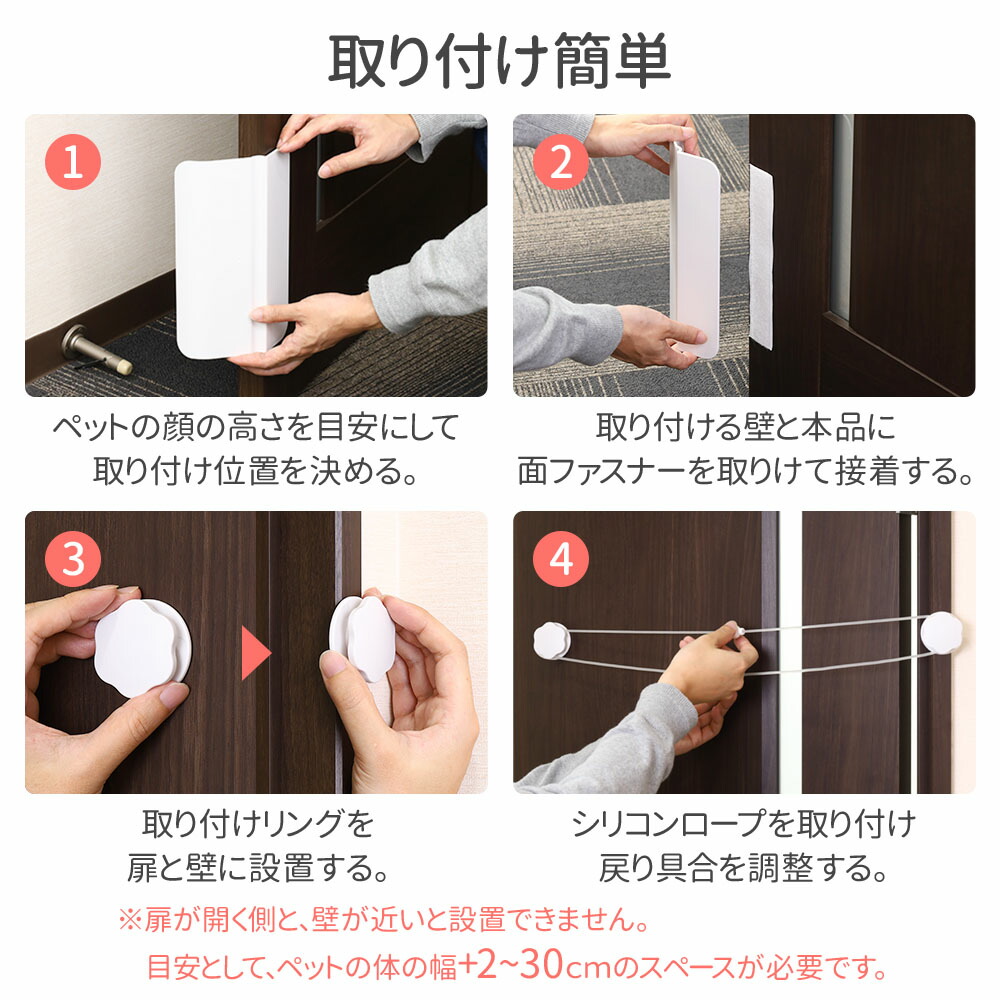 扉と壁をシリコンロープでつなぐことによって、ペットが通り抜けたあとは自動で閉まります。