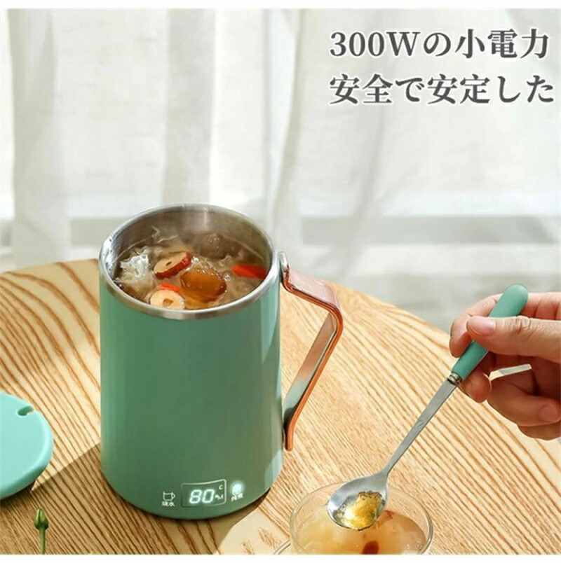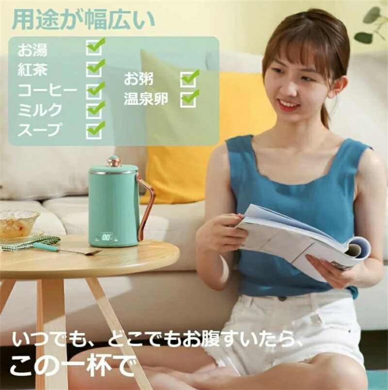 【多用途】この小型な電気ケトルは用途が幅広いです。お湯、紅茶、コーヒーなど全部できます。また、お粥、スープを作ることもできます。お腹すいたら、卵でもこのマグケトルで作れます。深夜まで残業の時、このマグケトルが大活躍です。