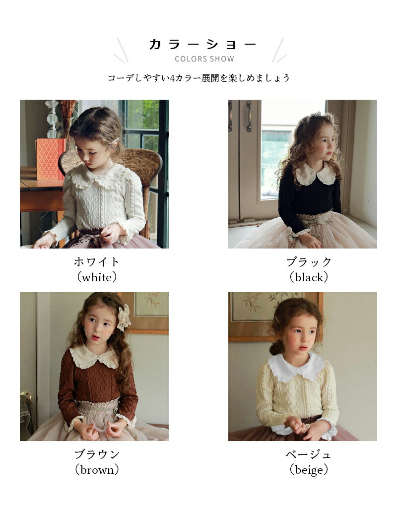 関連キーワード【ニットセーター】【子供服】【女の子】 セーター キッズセーター キッズトップス ホワイト ブラック ブラウン ベージュ 白 黒 生成り 秋トップス アランニット 丸襟 ラウンドカラー フリル 春秋 秋冬 子ども 可愛い 甘い 清楚 トップス 100cm 110cm 120cm 130cm 140cm 150cm 四歳 五歳 六歳 七歳 八歳 九歳 十歳 十一歳 十二歳 可愛い ふんわり 華やか エレガント 伸縮性 ボトムス おしゃれ 春秋 秋新作